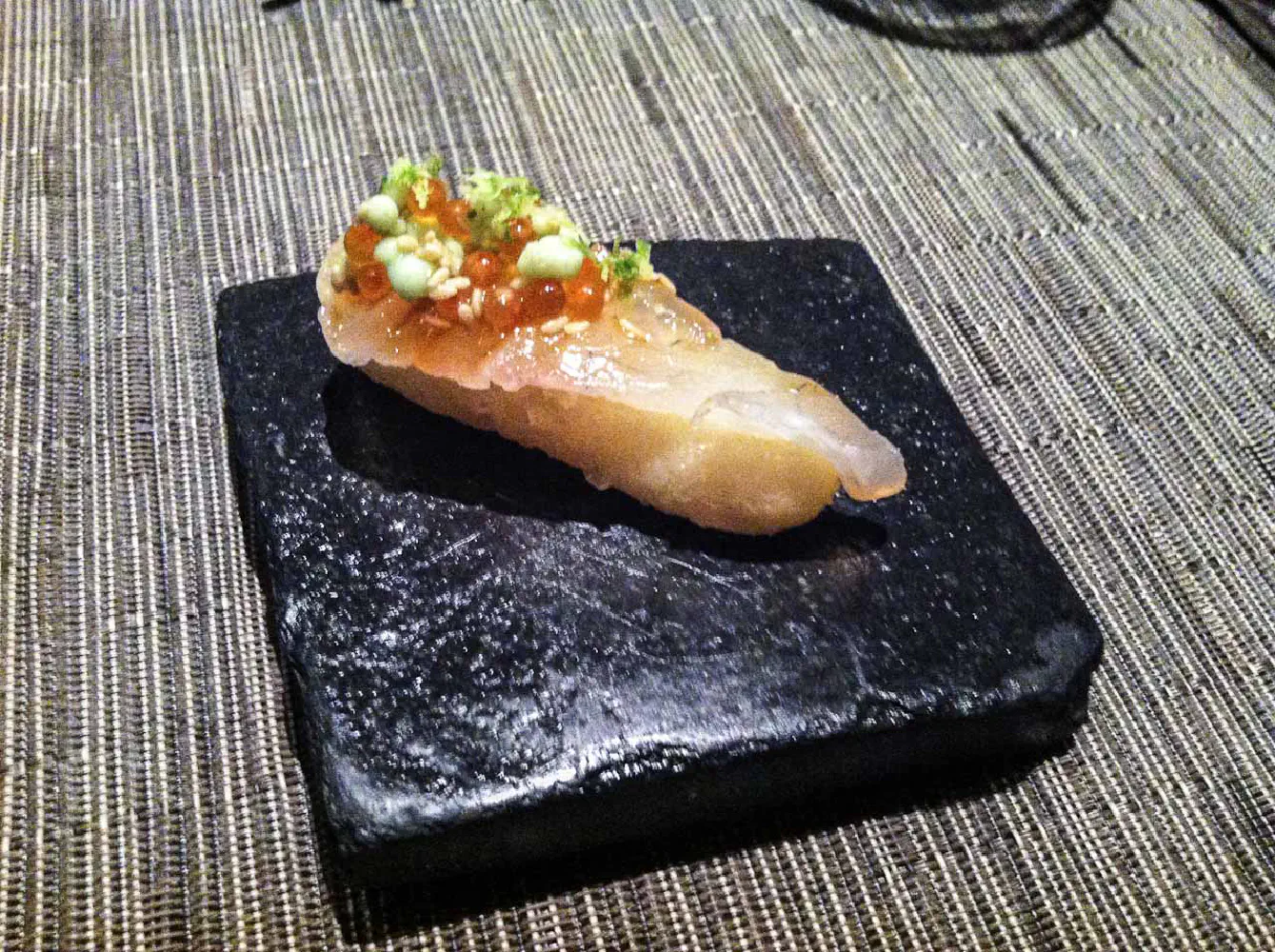 1. Nigiri, salsify, seaweed, and sesame. This was pretty good although nothing revolutionary to me. It tastes similar to yellowtail nigiri. The one thing that was interesting was the rice. It was very fine, like if you took a lot of rice and compacted it as much as possible. I wished there was more of whatever sauce they used on top of the fish, which was basically something similar to ponzu.