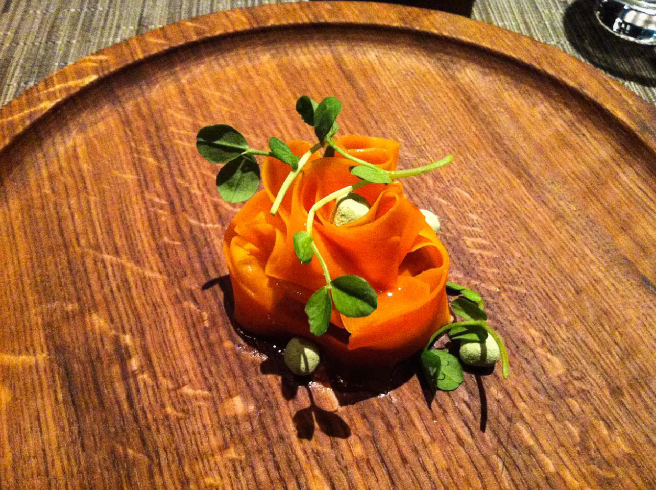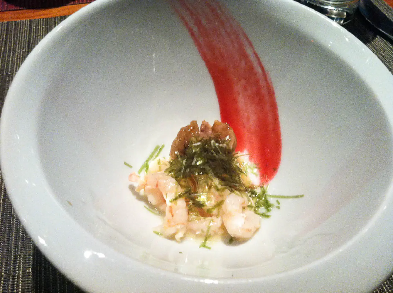 2. Sweet shrimp, ‘pine needles’, chestnut, cranberry. This was really good. The sweet shrimp was tasty. I don’t remember what the ‘pine needles’ were made of. The chestnut was soft and mushy, and the cranberry glaze was also good. There’s actually some shrimp flavored broth at the bottom of the bowl.