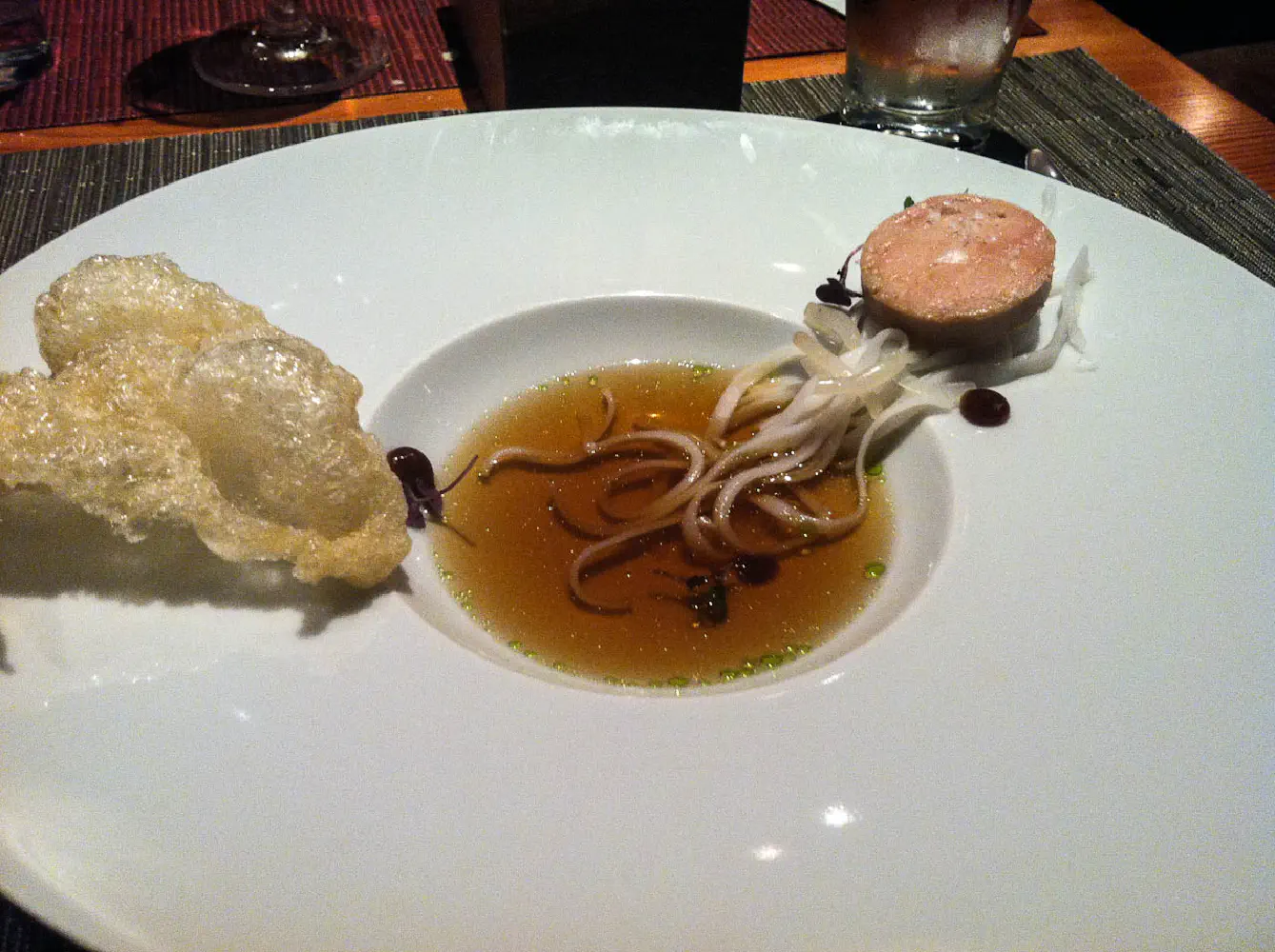 3. Pho gras. This was the chef’s take on Vietnamese pho with foie gras as the meat. The noodles are similar to Taiwanese flat rice noodles you would typically find in beef noodle soup. The puffy component on the left was similar to a fried pork fat. The circular part to the right is basically foie gras and some other components that I don’t remember. When all components were mixed together into the bowl, it was a perfect explosion of taste. The soup broth was similar to something I’ve made for Taiwanese beef noodle soup, but it also had a nice sour kick to it.