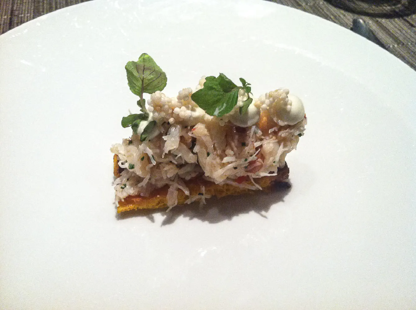 6. Crab toast, saffron, kaffir-yogurt, arare. I love this dish. They used a lot of crab, and I loved the sweetness of the crab meat mixed with the saffron and yogurt.