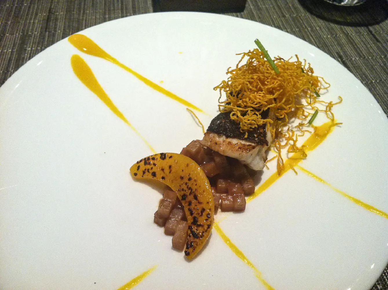 7. Snapper, squash, cherry, juniper, couscous. The one thing to take from this dish is the couscous. The couscous, I believe, are the little tiny square blocks. If you have ever tasted those gel blocks that runners use, it tastes exactly like that. Very strange but delicious. The snapper was tender, and the rice noodle looking things (juniper?) added a crispy texture to the snapper when eaten together.
