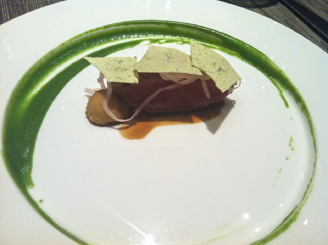 8. Squab, tomato hummus, pickled turnips, tzatziki. On the top is either liquid nitrogen frozen tzatziki or tomato hummus. The squab, which is domesticated pigeon, was very good and tender. The green sauce tasted like hummus too. The round circular ball next to the left of the squab was some type of potato textured thing. All together, I think the Greek inspired dish was pretty good.