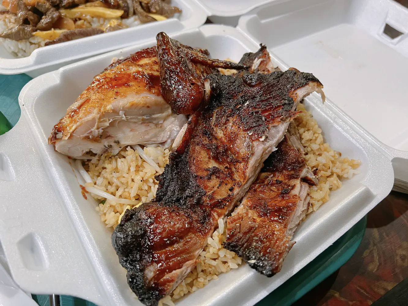 The 2 ribs, 1/4 chicken (~$16) came with 2 pieces of spare ribs on top of roast pork fried rice. The ribs themselves were very dry and not tender at all. The glaze on the ribs was a little on the salty side for me. The chicken was also very dry, and unfortunately, the meat was very salty. Luckily, the aji sauce was able to hide the saltiness of the meat. The roast pork fried rice was just OK.