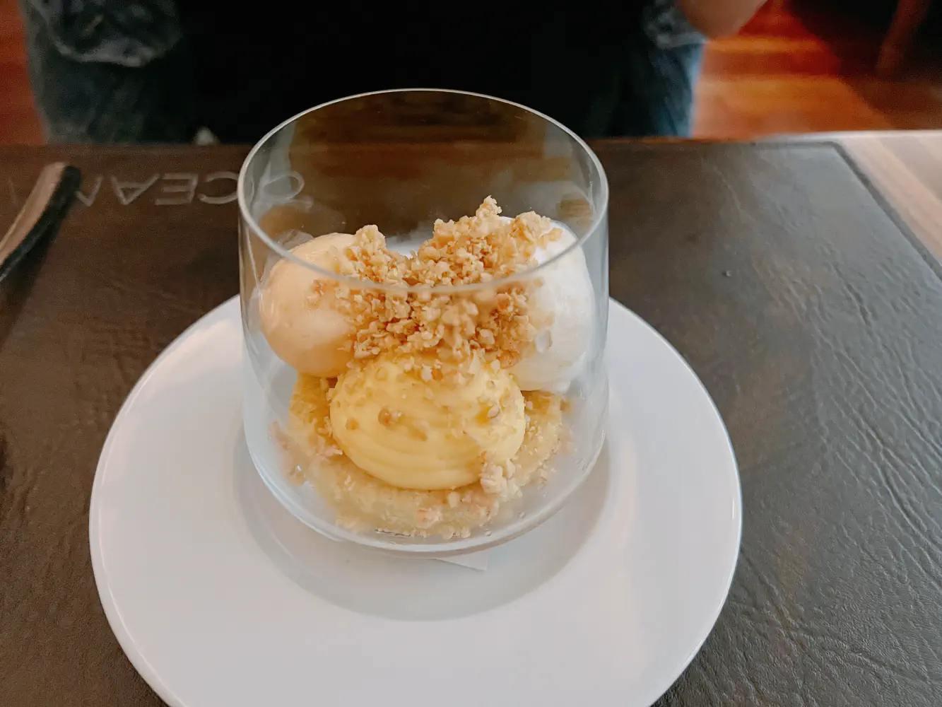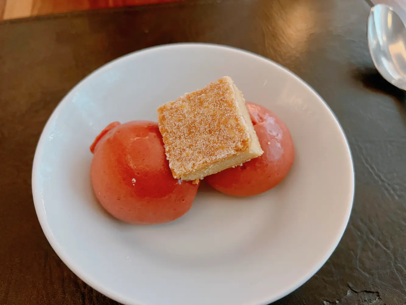 For dessert, my partner’s Orange Dreamsicle Parfait came with orange cream, olive oil cake, oatmeal crumble, orange sorbet, and orange espuma. This was pretty good. It was not heavily orange flavored and also not too sweet.
