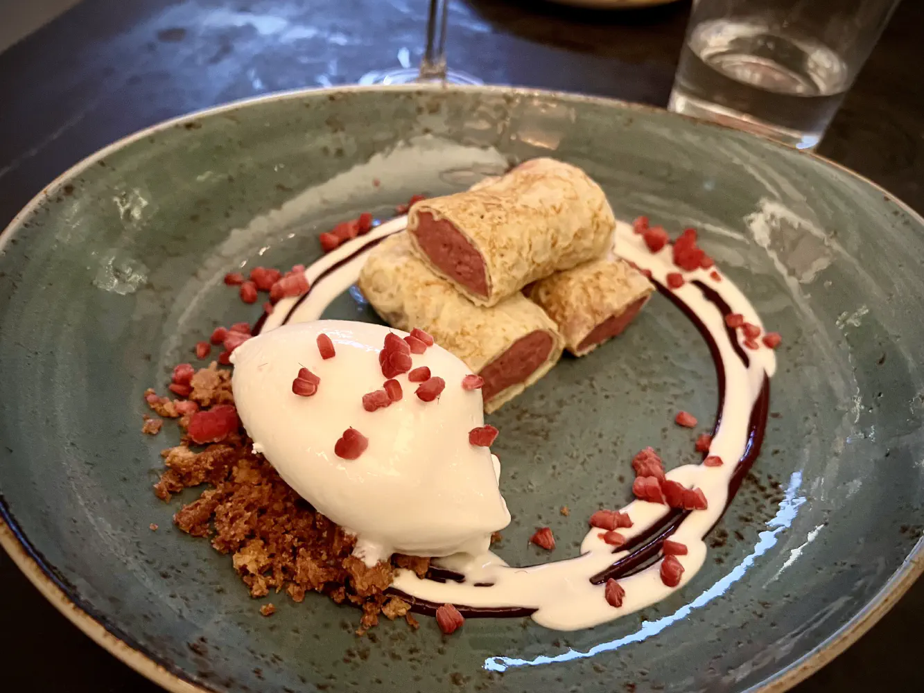 The Filloas Rellenas ($12) came with Galician-crepe, raspberry & white chocolate mousse, yogurt ice cream, and a cookie crumble. This dessert tasted basically like a crepe with mousse in it. It’s a light dessert, and it was decent.