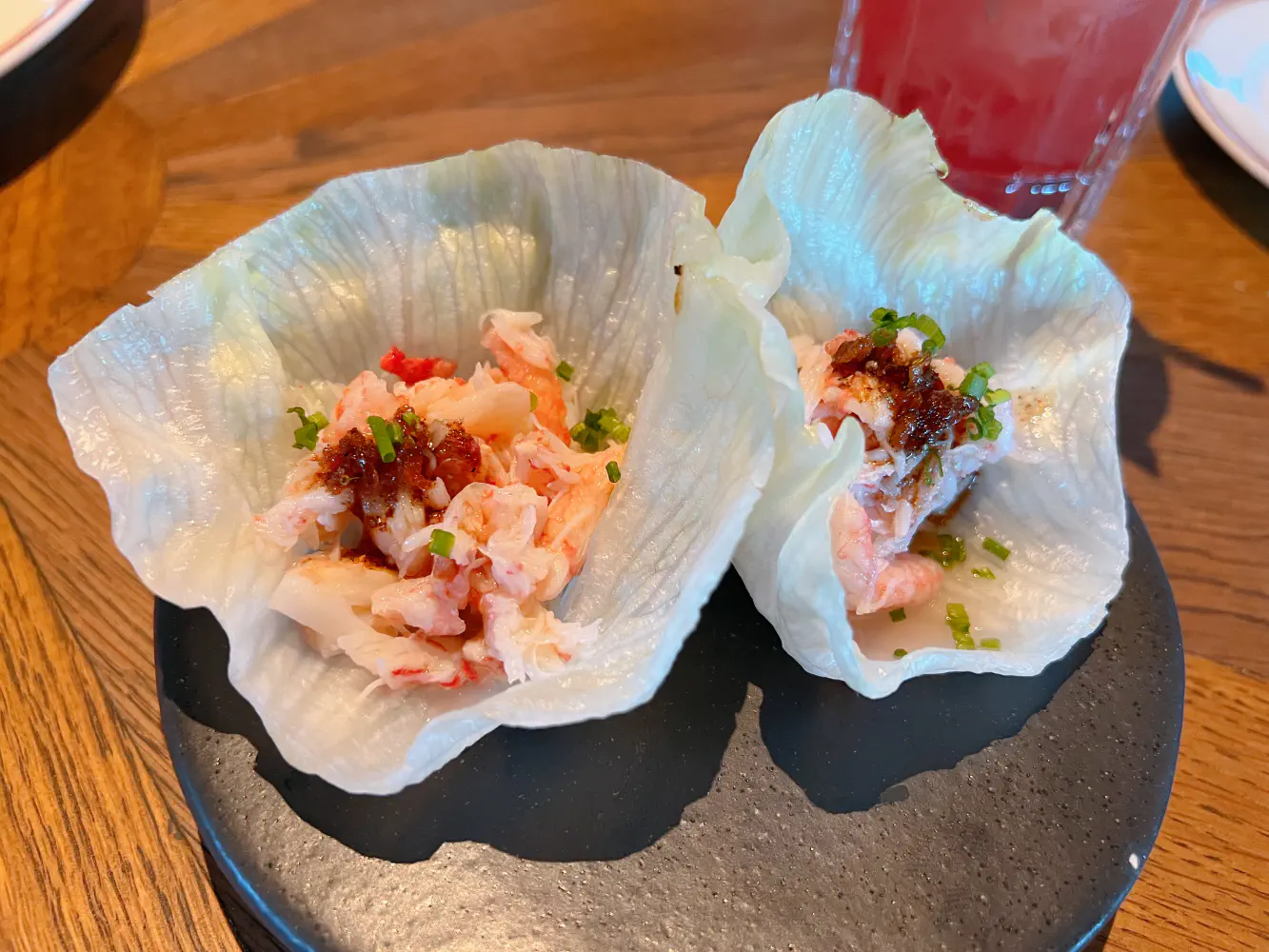 The Spicy Crab Lettuce Cups ($24 for 2 pieces) came with an Italian chili crisp. Arguably, this was pretty expensive for what it is, but what was great about this was there huge chunks of crab in it. It’s unfortunate that crab is so expensive in this city, but the crab had delicious sweet natural flavors and textures. It definitely had small hints of heat, but they don’t linger.
