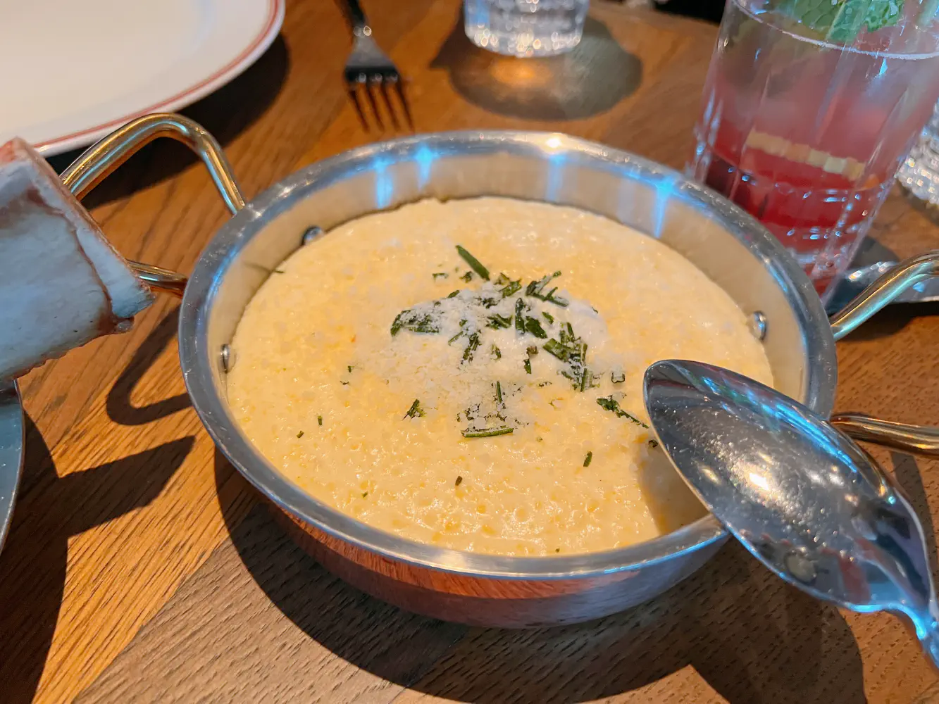 the mozzarella sticks with caviar lacked flavor, the Caesar salad didn’t have a lot of dressing, the bread wasn’t that cheesy and the polenta was more like porridge and was cold
