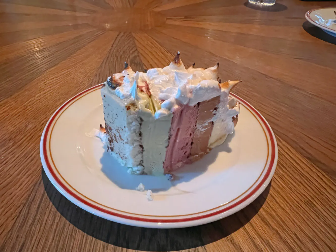 The insides of the baked spumoni had pistachio(?), cherry(?), chocolate, and vanilla ice cream inside. The outsides were subtly melted burnt marshmallows with some flavors of the flambéed liqueur. It was quite heavenly.