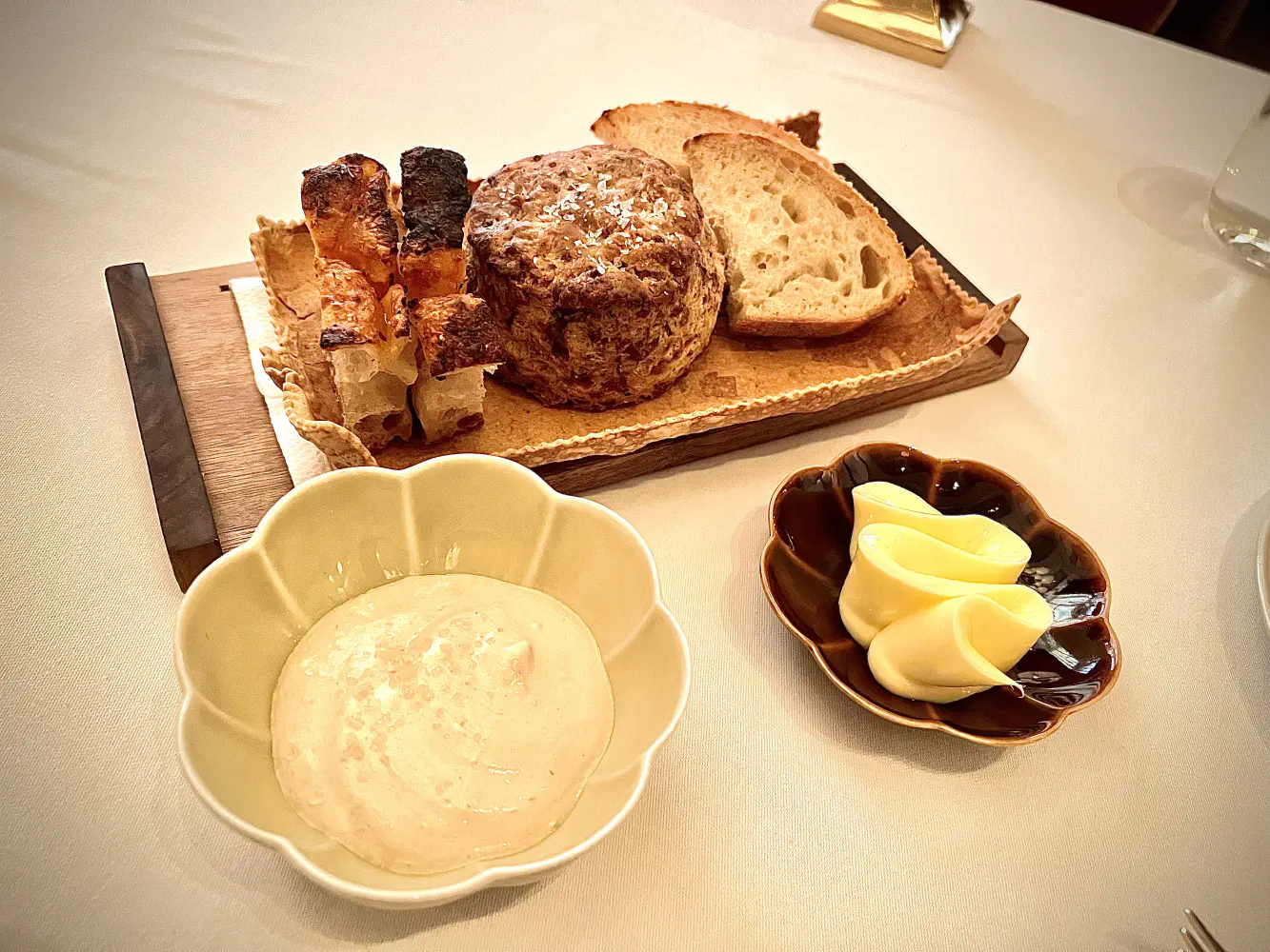 The complimentary bread came with 4 things: sun-dried tomato focaccia bread, some dense bread that I forgot what it was, sourdough slices, and a bread basket made of water crackers. On the side, they gave some sort of onion dip and very delicious butter. The onion dip reminded me of the Ruffles onion seasoning dip, and the butter was from (I believe) France. The crackers dipped with the onion dip were delectable, and the breads were delicious with the butter.