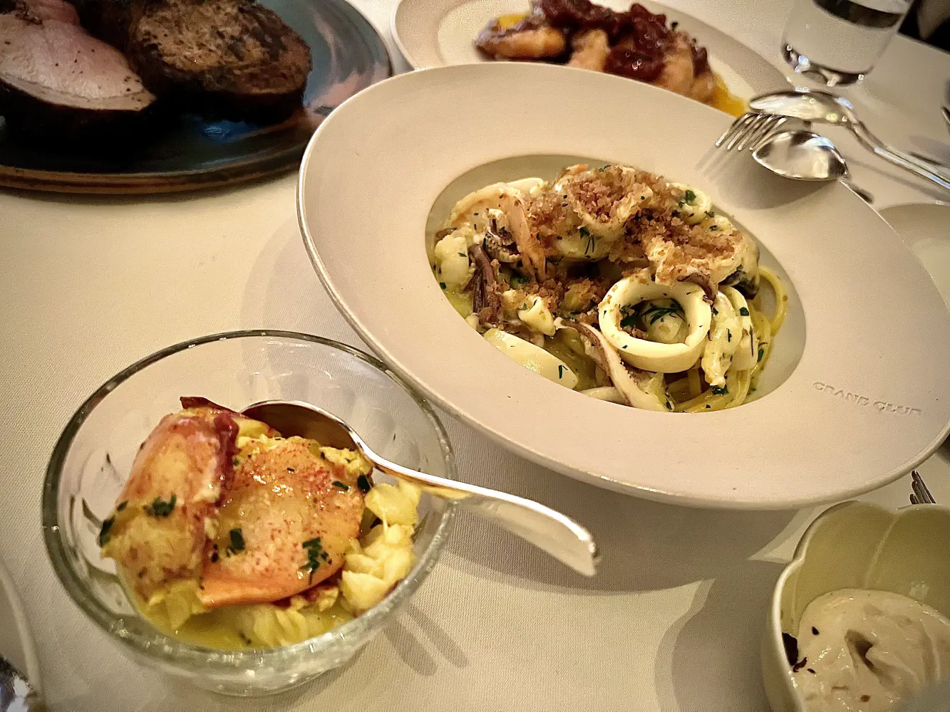 The Spaghetti ($40) came with frutti di mare, saffron, mussels, lobster, squid, shrimp, and soft herbs. We asked for the lobster to be on the side. The spaghetti was cooked perfectly al dente, and the sauce was very delicious. It had olive oil, lemon, saffron, and plenty of seasoning in it. The seafood was all very fresh, pungent, and tasty.