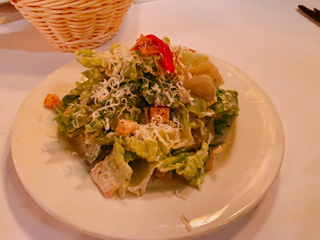 The caesar salad came with lettuce, cheese, dressing, and an anchovy on top. I thought this was the quintessential caesar salad. Everything tasted fresh and crisp. The parmesan was freshly grated, and they put a piece of anchovy to show that the sauce has some of it. The waiter split the Caesar salad for us by intuition, so it was very appreciated without having to mention it.