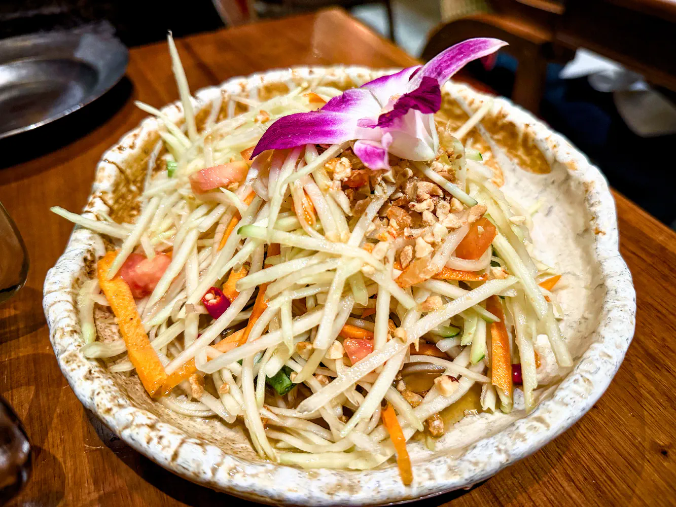 The Papaya Salad ($16) came with shredded green papaya, dried shrimps, string beans, tomatoes, and peanut with chili lime dressing. This was ordered mild, but it was a bit spicier than expected. Overall, this tasted just OK. It tasted like it was scrappily and hastily put together as the ingredients and dressing did not really have time to soak with each other.