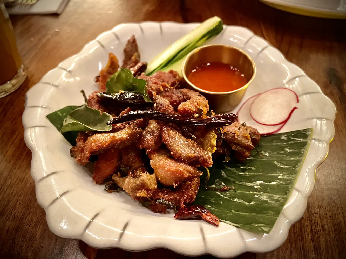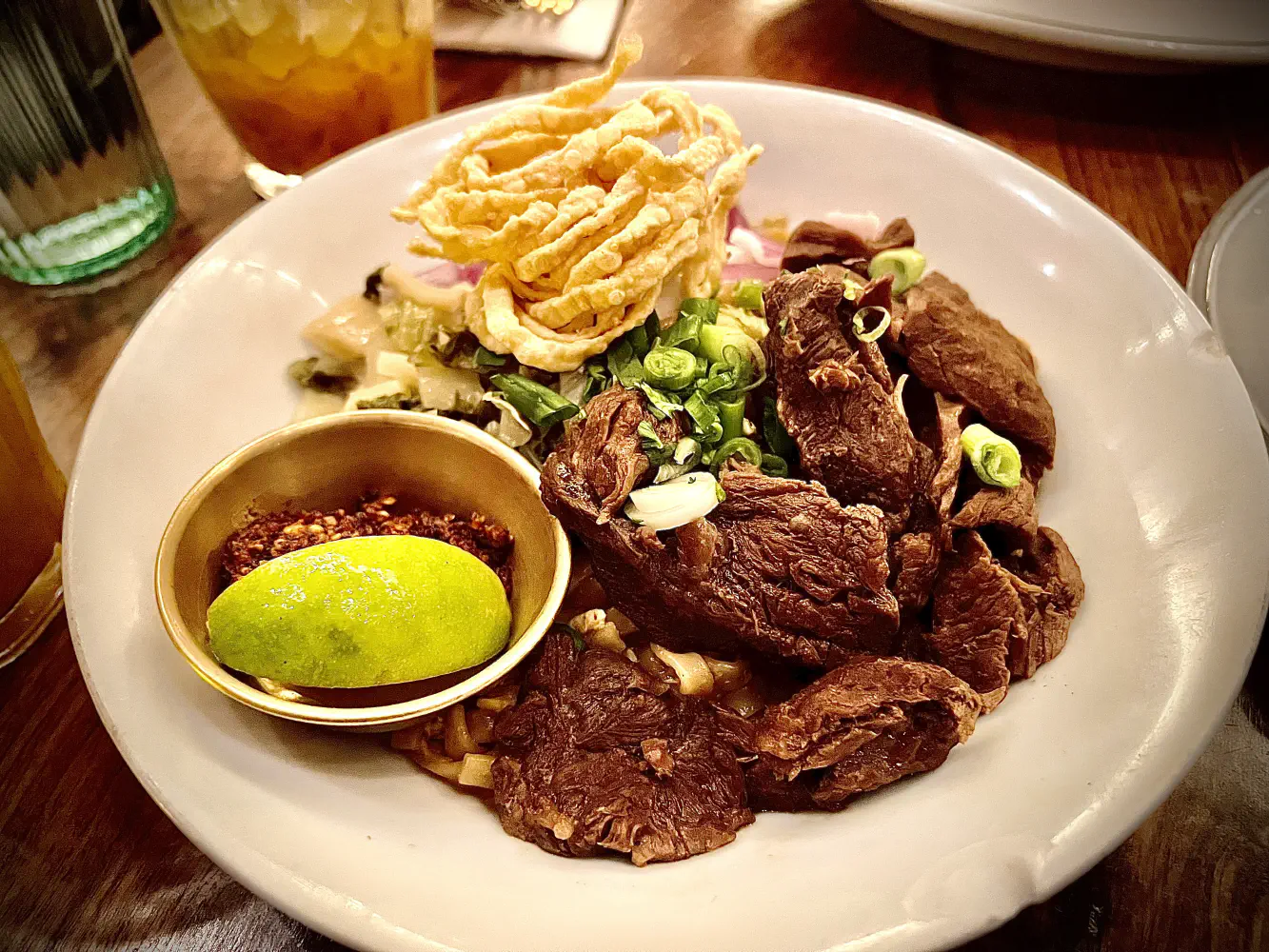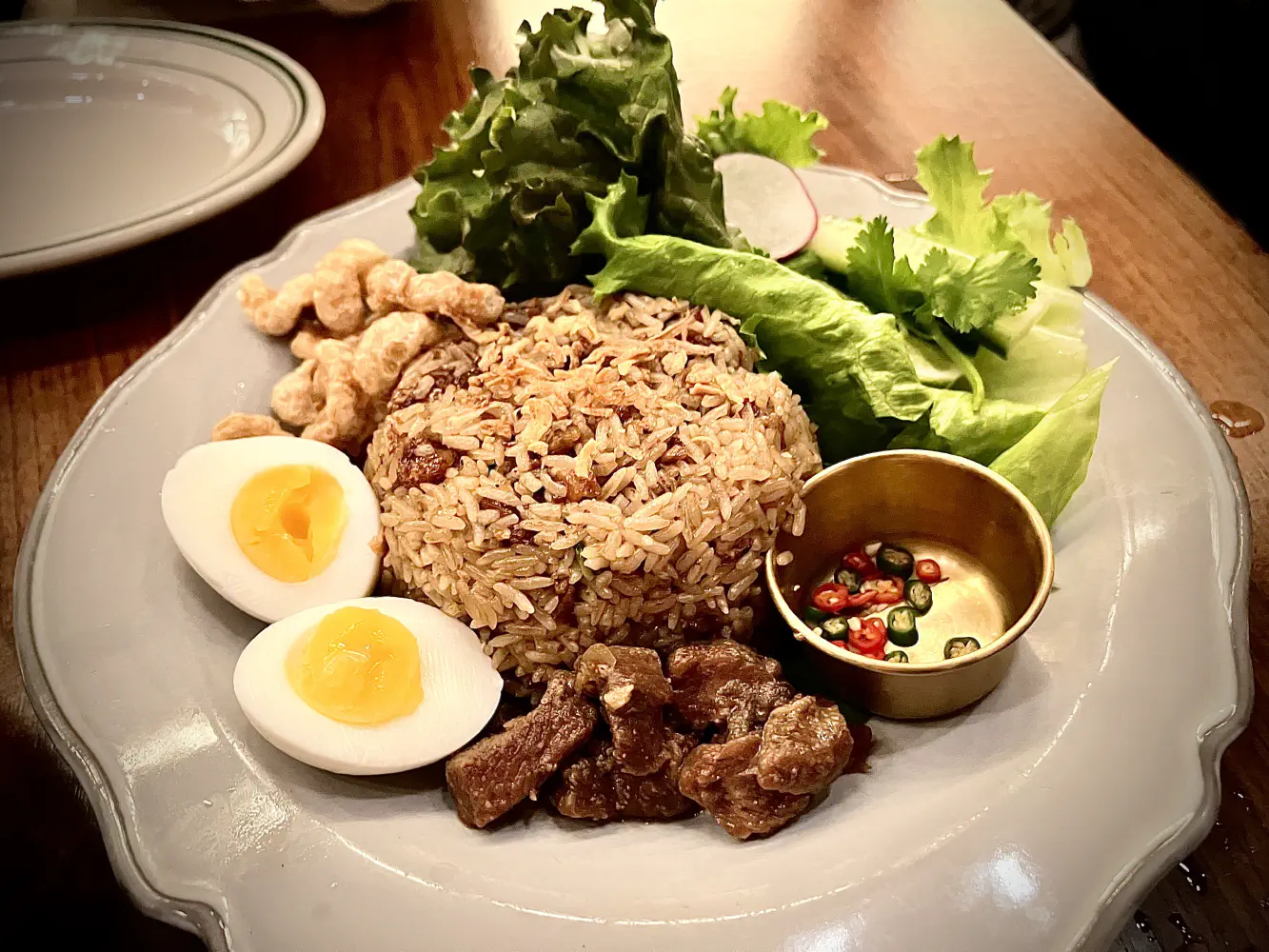 The Kao Soy Kua Neur ($28) came with sauteed egg noodles with chili paste, eggs, braised beef, red onions, lime, cilantro, and pickled mustard greens. The braised beef was extremely tender, easily torn apart with a fork. The egg noodles beneath the beef were pretty good. The pickled mustard greens were lightly pickled, and I wished they had stronger pickling. In all, this dish was pretty good for what it was, though I think the price was high for it.