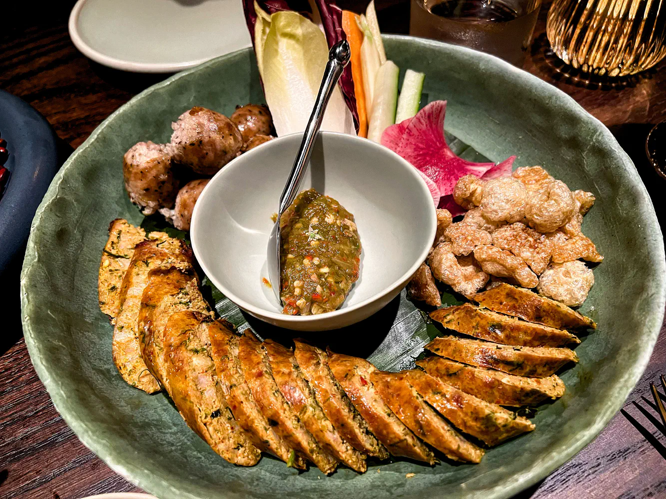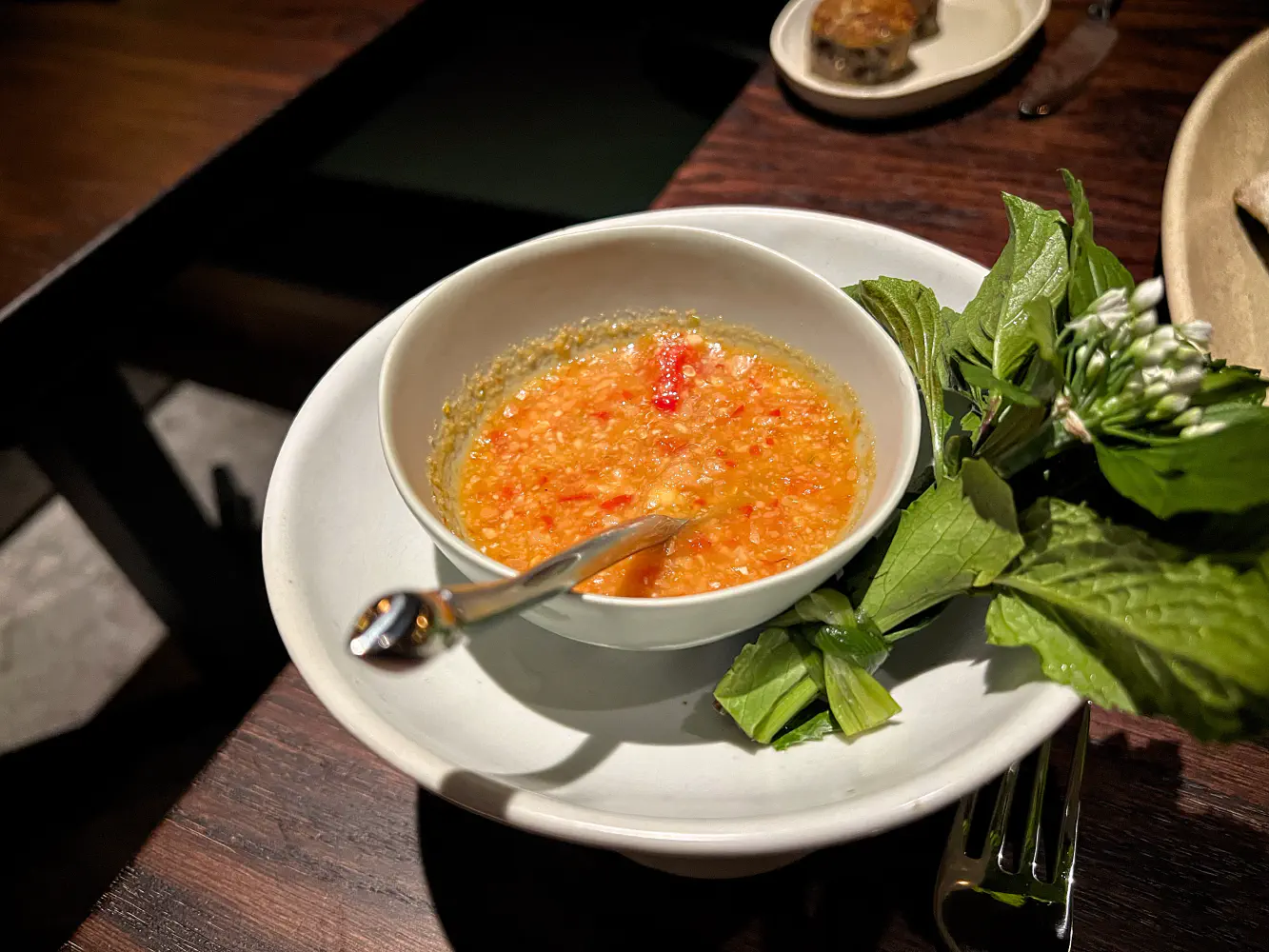 The Thai Sausage Platter ($32) was a duo of house-made sausages: sai ua, herbal and mildly spicy, and sai krok isan, tangy and fermented. It was served with fresh vegetables, herbs, and jaew pla ra, a bold Thai fermented fish chili dip. The longer sausage at the bottom of the dish was had a lot of prominent herbal flavors. It was not my favorite. I much preferred the cut sausage at the top because it had some sour notes to it and was very flavorful. You don’t really need to dip it into the chili dip. The chili dip itself was decently flavored especially combined with the vegetables, though be warned that there is some sudden heat if you eat too much of this in one bite.