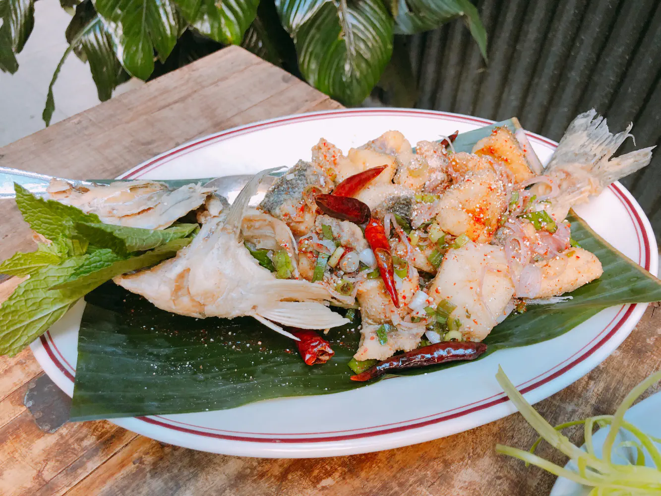The larb pla tod is a whole fried branzino with shallots, fresh mint, lime, and chilies. They basically filet both sides of the branzino and fry the meat with various spices. Some parts of the fish are fried deeply such that you can also get your keratin dose in, e.g. the tail and the edges of the fish. After finishing the meat chunks, there is still a lot of meat in the head and around the cheek bones. I think if you know how to clean the fish end to end, this is a really good deal considering how much flavor it has with all the spices.
