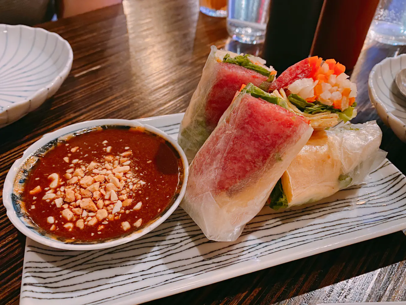 The sausage roll was rice paper rolls wrapped with sliced sausages, fried egg, carrot, and cu san. It’s served with peanut hoison sauce with toasted peanuts. This was like the normal spring rolls you’d get at a Vietnamese restaurant but without the shrimp. Despite that, it still tasted pretty good. The rice paper was pretty clean and fresh as the edges weren’t dry. The hoisin with peanuts wasn’t too sweet and was a nice dipping sauce.