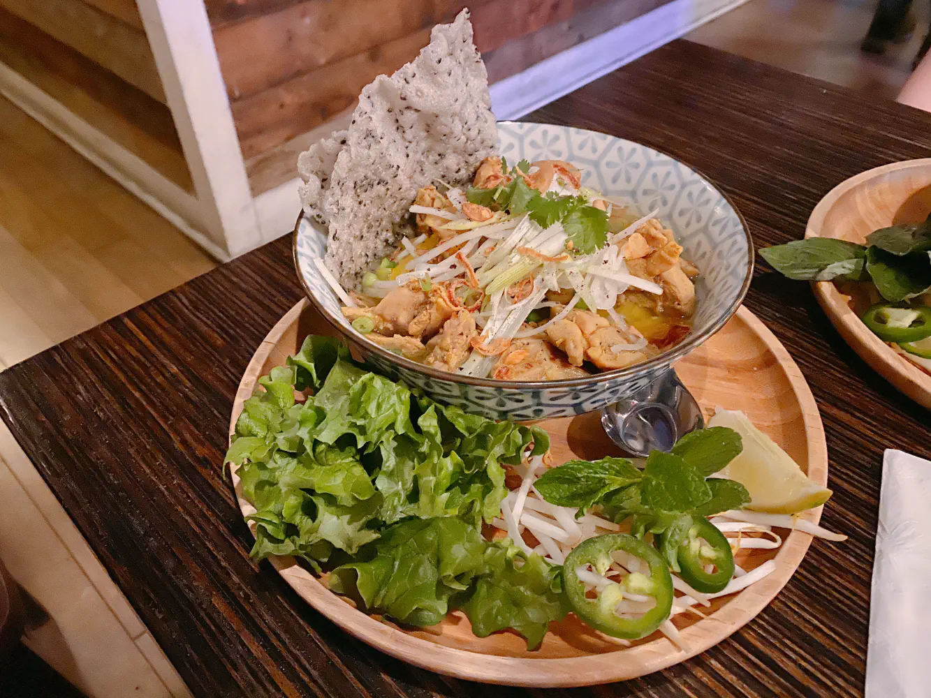 The chicken noodle came with chicken broth, tumeric noodles, and topped with poached chicken thigh. It’s served with cilantro, sesame cracker, bean sprouts, lettuce, lime, mint, and jalapeño on the side. The tumeric noodles were bursting with flavor. The noodles themselves remind me of fettucine. The broth wasn’t very plentiful, but it was flavorful. The broth had a lot of saltiness to it, and so it was understandable that there wasn’t a lot of broth. It reminded me of a dry/wet noodle combination.