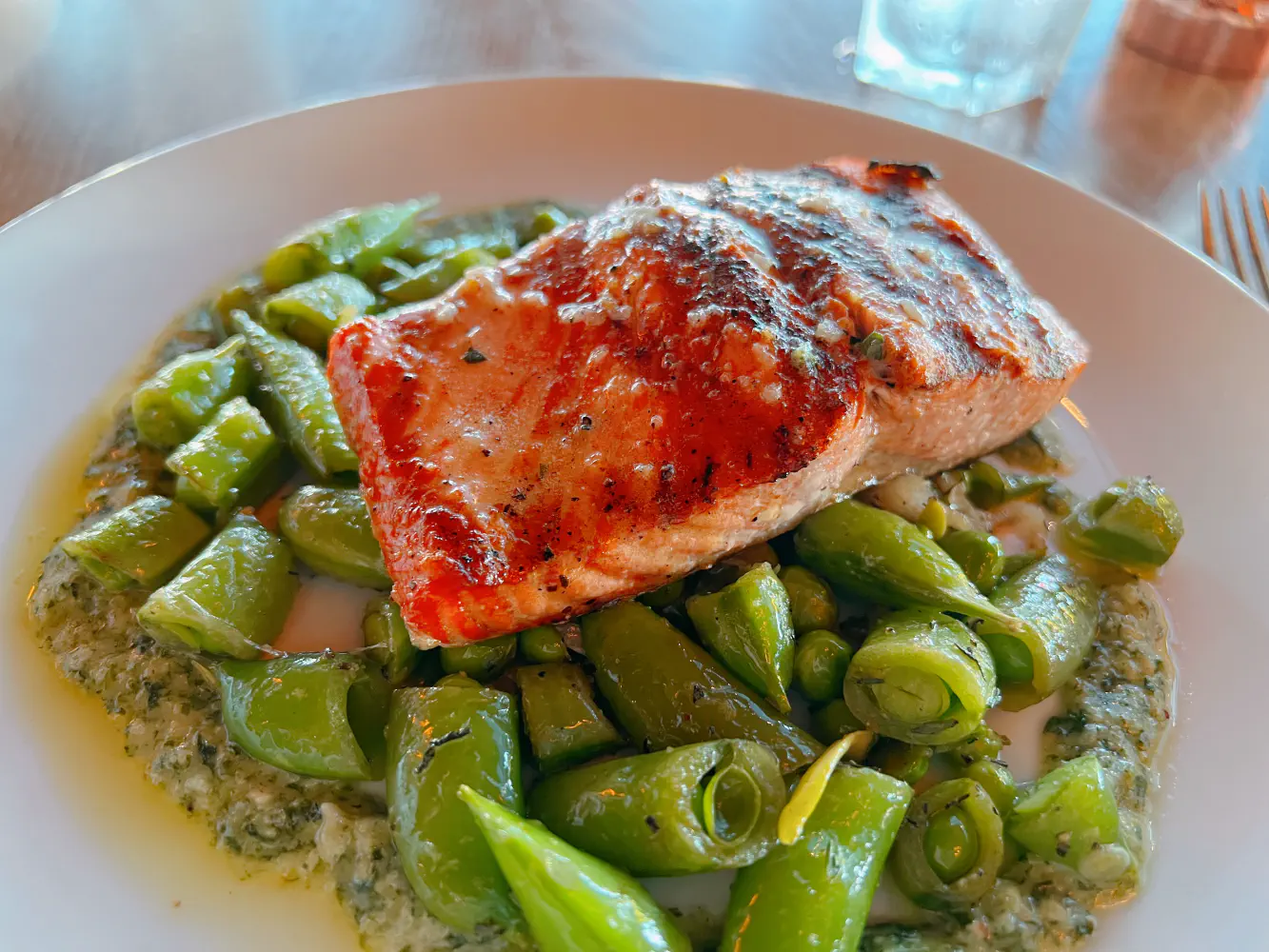 The Fresh Grilled Copper River Sockeye Salmon ($39) came with snap peas and a little garlic/pesto medley sauce of some sort. The fish itself was just OK. I asked for medium rare, but the meat came out more on the medium well side such that it was a little dry. The snap peas were crispy and tasted ok.